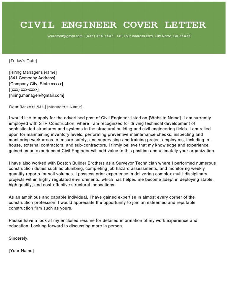 Civil engineer cover letter tips. By virtue of possessing a bachelor's degree in engineering and having worked in the said capacity. Cover for civil sample engineering job fresh letter graduate. Get your next job with the help of indeed career when writing a cover letter, be sure to reference the requirements listed in the job description. Read for inspiration or use it as a base to improve your own entry level civil engineer cover letter.